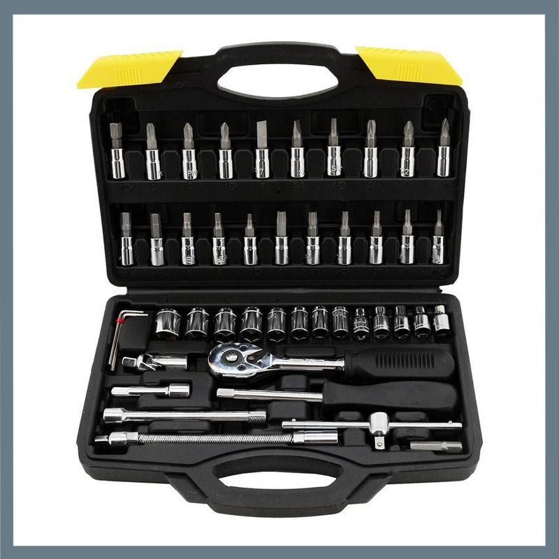 Praktická 46 dielna gola sada 1/4 palca s prvkami z chróm vanádiovej ocele CrV. Račňa je vybavená 45 zubovým mechanizmom pre presnú prácu.