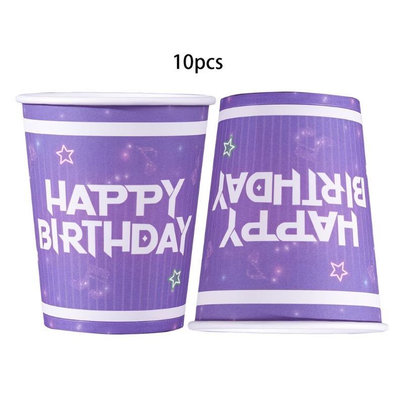 Toto 10-dielne balenie jednorazových papierových pohárov je ideálnou voľbou pre menšie stretnutia s priateľmi a narodeninové oslavy v užšom kruhu fanúšikov K-popu. Elegantnú, žiarivú fialovú farbu pohárov zdobia hviezdicové motívy, diskrétne noty a efektný nápis „Happy Birthday“. Nielenže sú praktické na podávanie nápojov, ale sú aj perfektným a estetickým doplnkom tematického stolového dekoru.