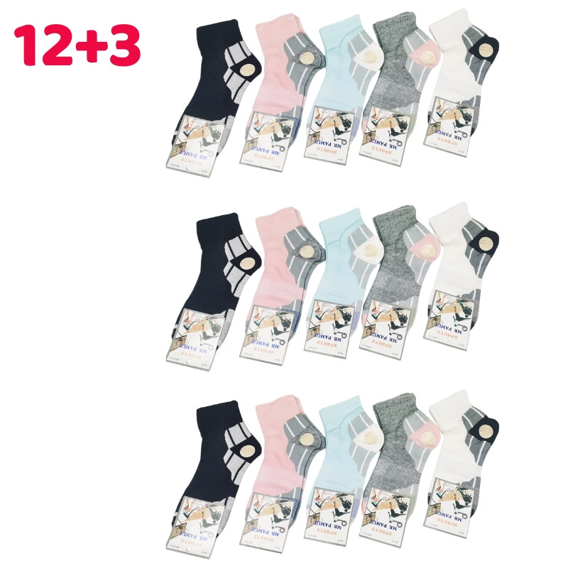 Pohodlná a praktická sada dámskych športových ponožiek, ideálna na každodenné nosenie aj športové aktivity. Balenie obsahuje 12 párov ponožiek a 3 páry ako darček, takže celkovo dostanete 15 párov.