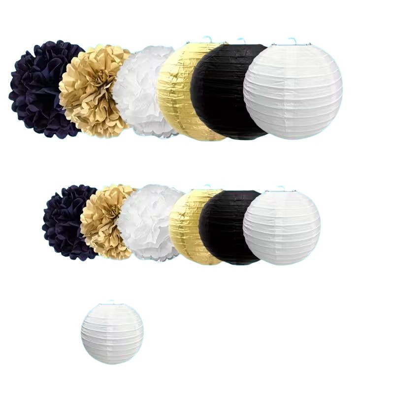 Vykúzlite elegantnú a slávnostnú atmosféru na akejkoľvek udalosti s touto 13-dielnou zmiešanou súpravou dekorácií. Klasická kombinácia čiernej, zlatej a bielej farby je dokonalou voľbou na promócie, narodeninovú oslavu, silvestrovskú (novoročnú) párty alebo akúkoľvek slávnostnú príležitosť. Súprava obsahuje papierové lampióny a kvety z hodvábneho papiera (pom-pomy) rôznych veľkostí, s ktorými vytvoríte pôsobivú stropnú dekoráciu alebo fotopozadie.