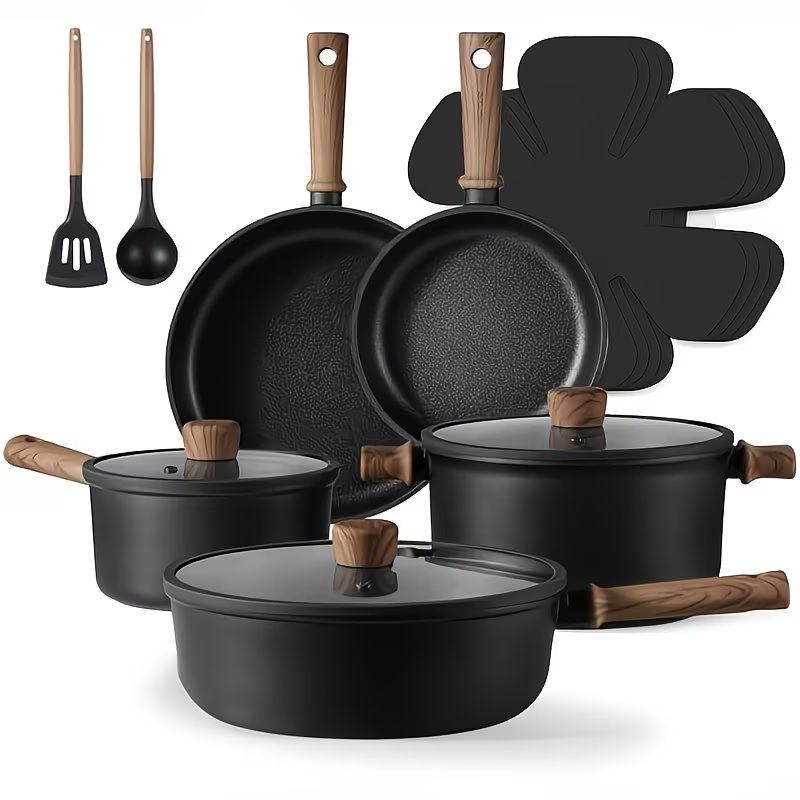 Moderná, kompletná sada kuchynského riadu, ktorá je ideálnou voľbou pre všetky základné úlohy pri varení a pečení. Čierny, viacvrstvový nepriľnavý povrch uľahčuje prípravu jedál a čistenie, zatiaľ čo rukoväte s dreveným vzhľadom zaisťujú estetický a pohodlný úchop.