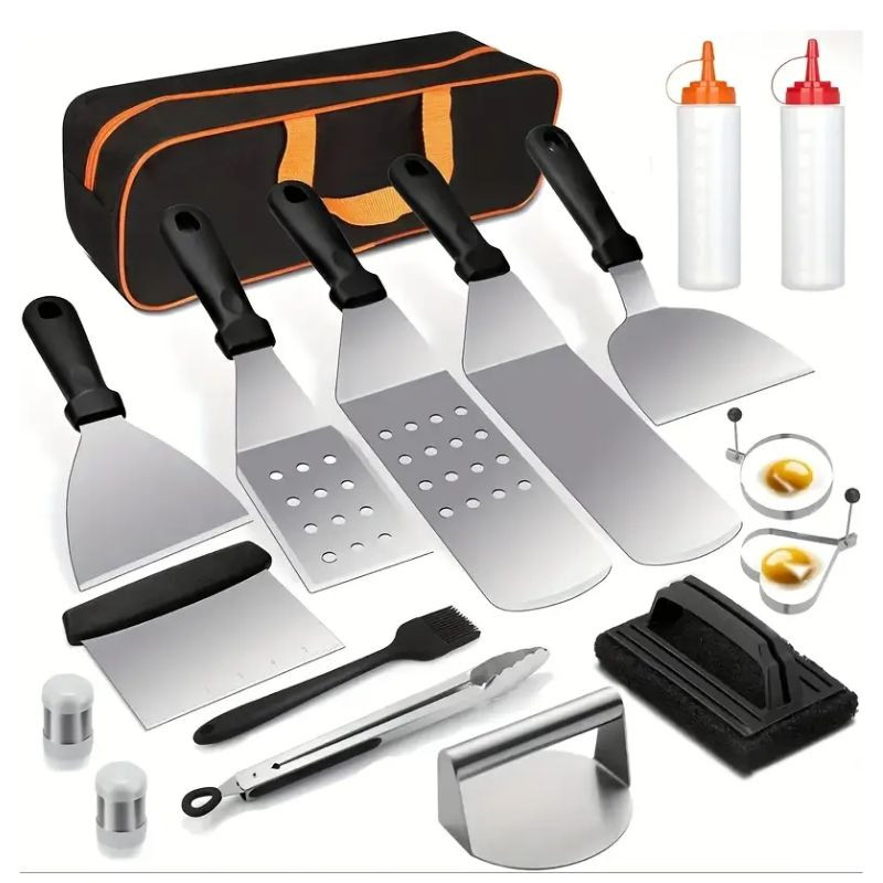 Táto kompletná sada na pečenie a grilovanie je ideálnou voľbou na domáce varenie, BBQ aj na profesionálne použitie. Balenie obsahuje špachtle rôznych tvarov a veľkostí, krájacie a dávkovacie pomôcky, štetec, kovové krúžky, úložnú nádobu a fľašu na omáčku, teda všetko potrebné pre efektívnu a všestrannú prácu v kuchyni.