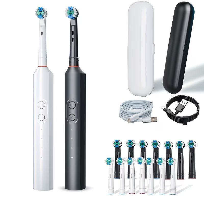 Táto prémiová sada elektrických zubných kefiek poskytuje kompletné riešenie ústnej hygieny pre páry alebo členov rodiny. Balík obsahuje dve výkonné kefky – jednu elegantnú čiernu a jednu čistú bielu – ktoré kombinujú modernú technológiu s pohodlným používaním.