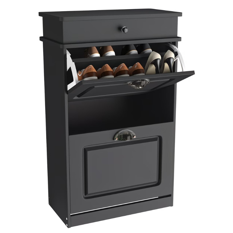 Za dvoma samostatnými, nadol sa otvárajúcimi dvierkami sa nachádzajú usporiadané priehradky na topánky, ktoré umožňujú pohodlné uloženie viacerých párov topánok. Uzavretá konštrukcia chráni topánky pred prachom a zaisťuje upravený vzhľad.