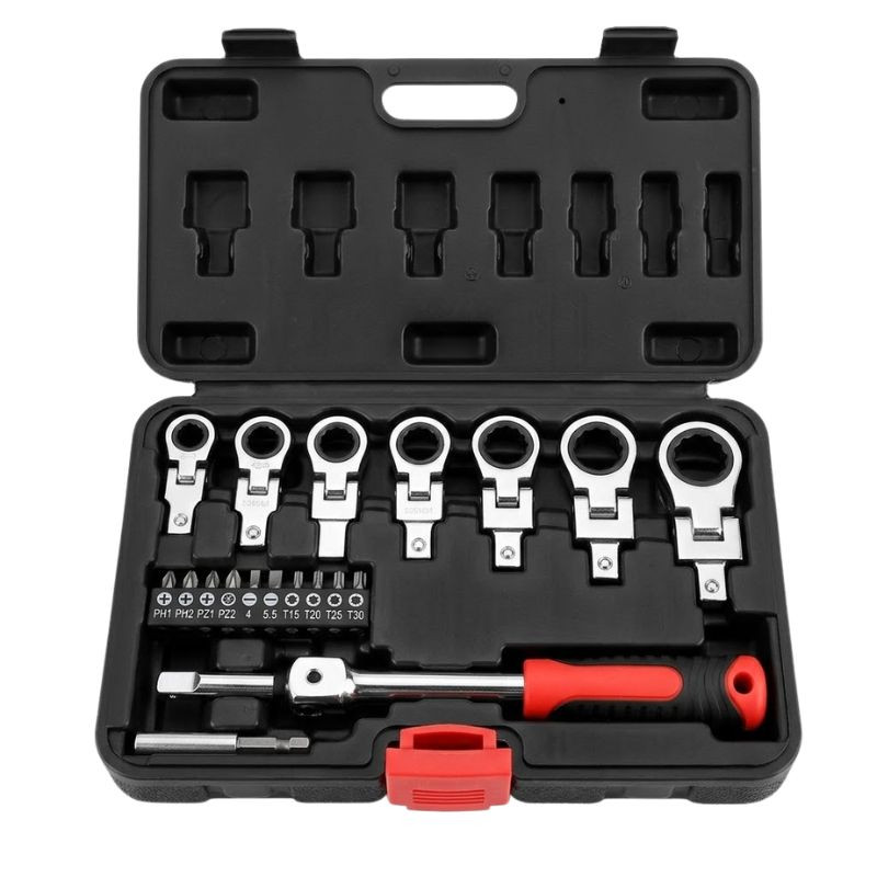 20-dielna sada hviezdicových a vidlicových kľúčov je praktická a univerzálna sada náradia, ktorá je ideálna na opravy automobilov, práce v dielni a domáce majstrovanie. Sada obsahuje hviezdicové a vidlicové hlavice rôznych veľkostí, bitové hlavice a predlžovaciu tyč, s ktorými je možné rýchlo a efektívne vykonávať množstvo montážnych úloh.