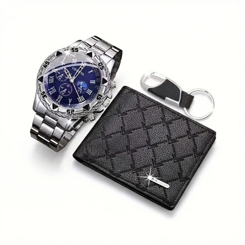 Prekvapte partnera, otca alebo kolegu štýlovou 3 dielnou sadou doplnkov, ktorá sa hodí k biznis vzhľadu aj k ležérnej elegancii. Balenie obsahuje nápadné náramkové hodinky, zladenú peňaženku a prívesok na kľúče. Kombinácia modrého ciferníka, striebornej farby hodiniek a čiernych doplnkov dodá nositeľovi sebavedomý dojem.