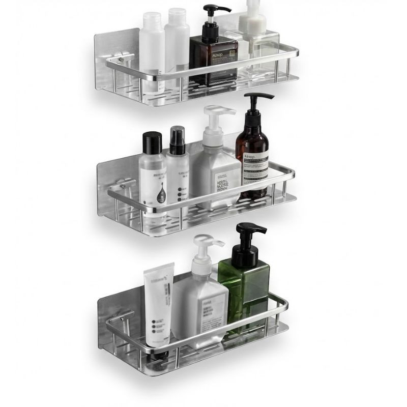 Táto sada pozostávajúca z 3 samostatných políc ponúka elegantné a praktické riešenie na usporiadanie kúpeľňových doplnkov. Čistý, strieborný povrch z hliníka dodáva miestnosti moderný vzhľad a zároveň pomáha pri prehľadnom ukladaní kozmetiky, šampónov a sprchových gélov.