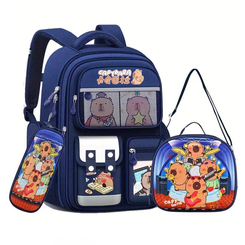 Veselý, roztomilý dizajn, ktorý obsahuje školský batoh s veľkou kapacitou 42 × 32 × 20 cm, obedovú tašku s ramenným popruhom 24 × 23 × 10 cm a puzdro na perá na zips 23 × 11 × 4 cm.