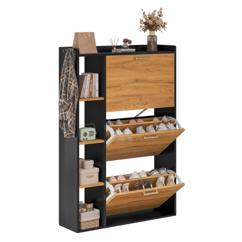 Táto skriňa na topánky s moderným dizajnom ponúka praktické a elegantné riešenie na prehľadné uskladnenie topánok. Priestor s tromi výklopnými dverami umožňuje priestorovo úsporné uloženie viacerých párov topánok, zatiaľ čo horná odkladacia plocha je ideálna na dekorácie, kľúče alebo predmety každodennej potreby.