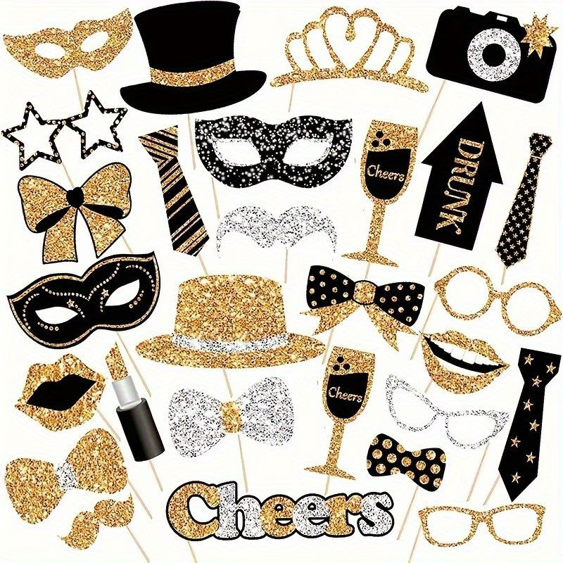 Urobte fotografie z vašej udalosti nezabudnuteľnými a vtipnými s touto elegantnou 30-dielnou sadou zlatých trblietavých rekvizít. Či už ide o svadbu, narodeniny alebo silvestrovskú párty, tieto doplnky zaručene oživia atmosféru a povzbudia hostí k spoločnému pózovaniu. V sade si každý nájde kúsok, ktorý vyhovuje jeho štýlu, od klasických fúzov a okuliarov až po moderné nápisy a masky. Trblietavý zlatý povrch dodáva fotografiám prémiový vzhľad, zatiaľ čo odolný papier zaisťuje jednoduchú manipuláciu počas celej oslavy.