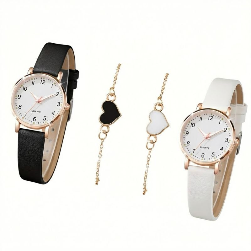 Obsah sady: 2 ks náramkové hodinky (čierne a biele), 2 ks náramky v tvare srdca (čierne a biele).