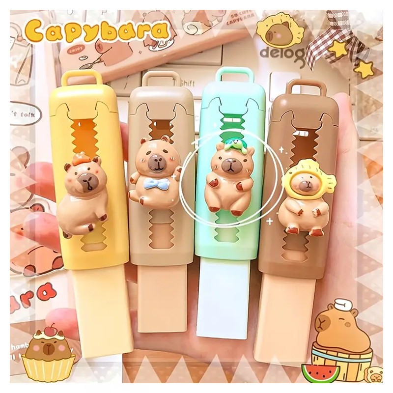 Táto 4-dielna sada gúm s kapybarou je nielen mimoriadne roztomilá, ale aj praktická. Každá guma má iný motív kapybary a výsuvné prevedenie, vďaka ktorému si jednoducho nastavíte dĺžku gumy podľa potreby. Gumuje čisto a pohodlne, pričom pružný, nelámavý materiál zabezpečuje dlhú životnosť. Kreatívny dizajn zaručene vyčarí úsmev.