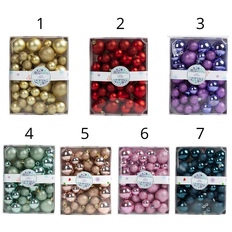 Táto sada 42 vianočných ozdôb je ideálnou voľbou na zdobenie vianočného stromčeka, vencov alebo slávnostných dekorácií. Ozdoby sú k dispozícii v rôznych farbách – s trblietavým, lesklým a matným povrchom – takže sa dajú ľahko zladiť s akýmkoľvek slávnostným štýlom a farebnou schémou.
