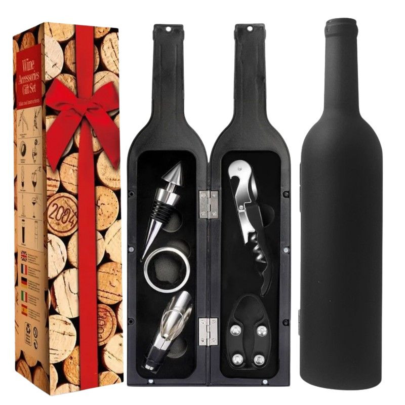 Táto elegantná darčeková sada je perfektnou voľbou pre milovníkov vína. Matné čierne puzdro v tvare fľaše je nielen štýlové, ale poskytuje aj praktické uloženie všetkých doplnkov potrebných na servírovanie vína. Ideálny darček k narodeninám, výročiu, kolaudácii alebo na sviatočné príležitosti.