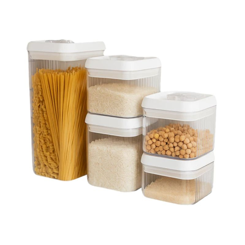 Táto päťdielna sada nádob na potraviny s elegantným reliéfnym vzorom ponúka ideálne riešenie na usporiadanie kuchynských surovín, ako sú cestoviny, ryža, strukoviny a iné suché potraviny. Nádoby vyrobené z plastu bez obsahu BPA sú priehľadné, takže ich obsah je ľahko kontrolovateľný. Špeciálny uzáver s silikónovým tesnením na bielych viečkach, ktorý sa ovláda stlačením tlačidla, zaisťuje vzduchotesné uzavretie, ktoré dlhodobo zachováva čerstvosť potravín. Obdĺžnikový tvar umožňuje úsporné a praktické skladovanie v kuchynských skrinkách alebo na policiach v komore.