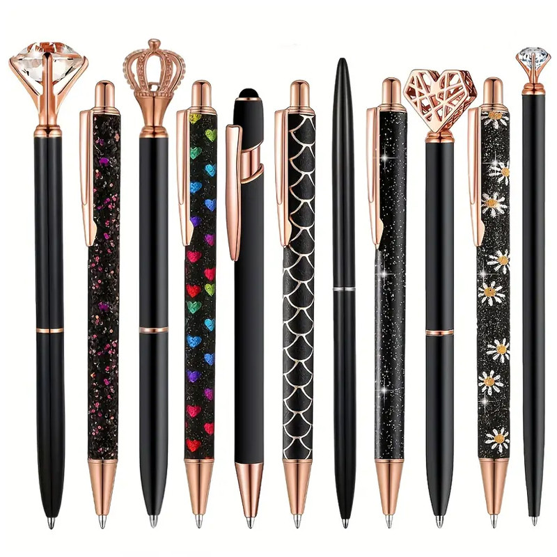 Táto 5-dielna elegantná sada guľôčkových pier je štýlovým doplnkom do peračníka aj na kancelársky stôl. Kovové telá pier sú ozdobené výraznými detailmi, ako sú trblietky, kryštálový efekt, perličky alebo motív srdiečka, vďaka čomu sú ideálne aj ako darček pre učiteľov, žiakov alebo napríklad do svadobnej knihy hostí.