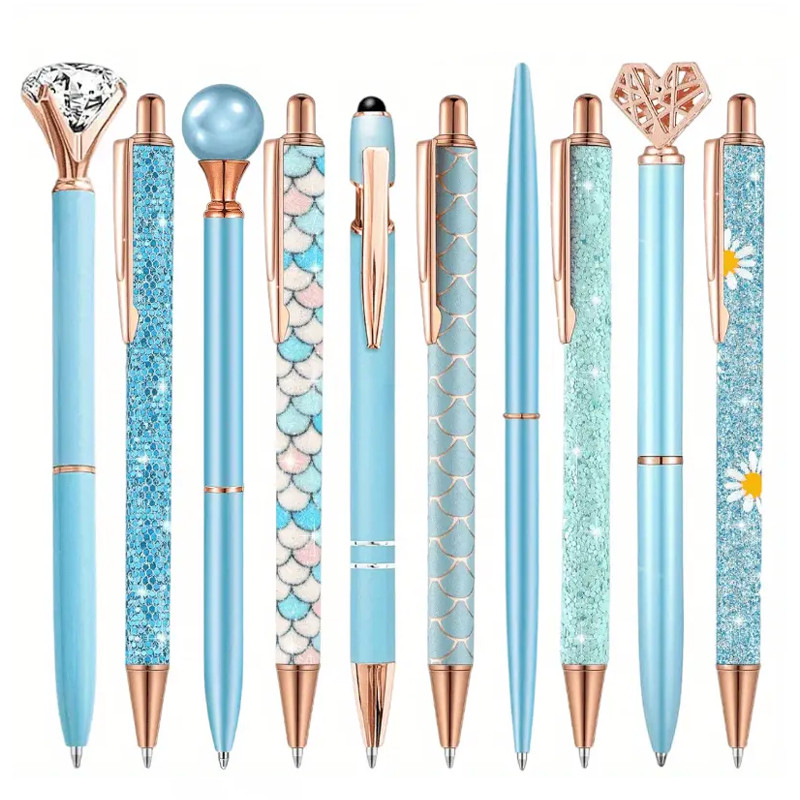 Táto 5-dielna elegantná sada guľôčkových pier je štýlovým doplnkom do peračníka aj na kancelársky stôl. Kovové telá pier sú ozdobené výraznými detailmi, ako sú trblietky, kryštálový efekt, perličky alebo motív srdiečka, vďaka čomu sú ideálne aj ako darček pre učiteľov, žiakov alebo napríklad do svadobnej knihy hostí.