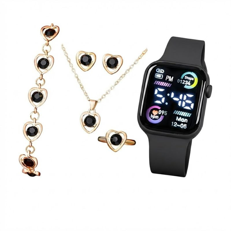 Táto 6-dielna dámska bižutéria a hodinky kombinujú modernú funkčnosť s klasickou romantikou. Súprava obsahuje elegantné čierne digitálne hodinky doplnené elegantnými šperkami zdobenými čiernymi kameňmi v tvare srdca. Táto sada je ideálnou voľbou na každodenné nosenie, ale zaručuje aj štýlový vzhľad na elegantných podujatiach, večierkoch alebo na dovolenke.