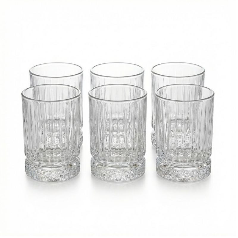 Sada obsahuje 6 identických pohárov, čo ju robí ideálnou pre rodinné večere, stretnutia s priateľmi alebo slávnostné príležitosti. Poháre majú hrubé steny a ťažkú, stabilnú základňu, čo zvyšuje ich odolnosť a dodáva im pocit vysokej kvality pri používaní.