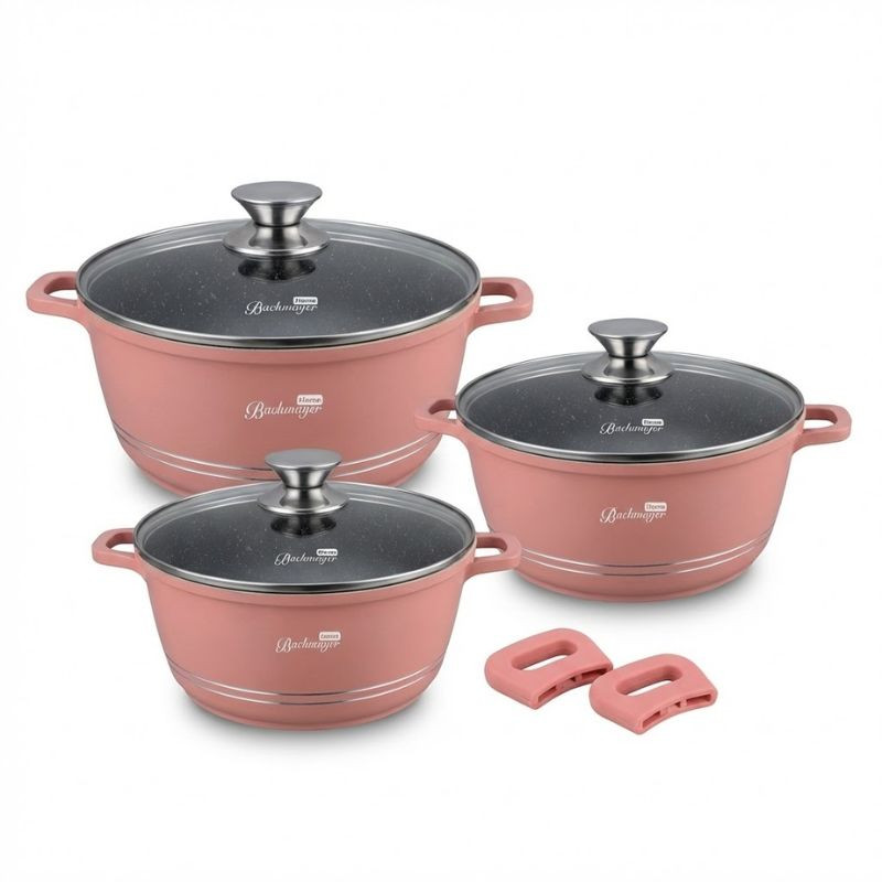 Sada Bachmayer Home BM-7777 je ideálnou voľbou pre tých, ktorí milujú kombináciu estetiky a funkčnosti. Unikátny vonkajší povrch v odtieni Nude Pink (pudrová ružová) odolný voči teplu dodáva vašej kuchyni nádych elegancie, zatiaľ čo vnútorný povrch v mramorovom čiernom prevedení s nepriľnavou úpravou zaručuje, že sa jedlo nikdy nepripáli.