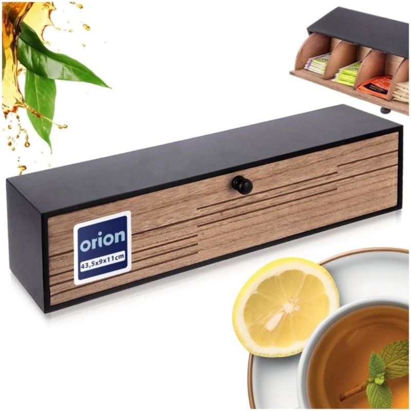 Úložný box je vyrobený z MDF, čo zaručuje stabilnú a odolnú konštrukciu. Povrch v prírodnom drevenom odtieni a čierny rám dodávajú tomuto doplnku moderný, no zároveň útulný charakter. Vďaka malému úchytu na prednej strane sa zásuvka ľahko vysúva, takže čajové vrecúška sú rýchlo a pohodlne dostupné.
