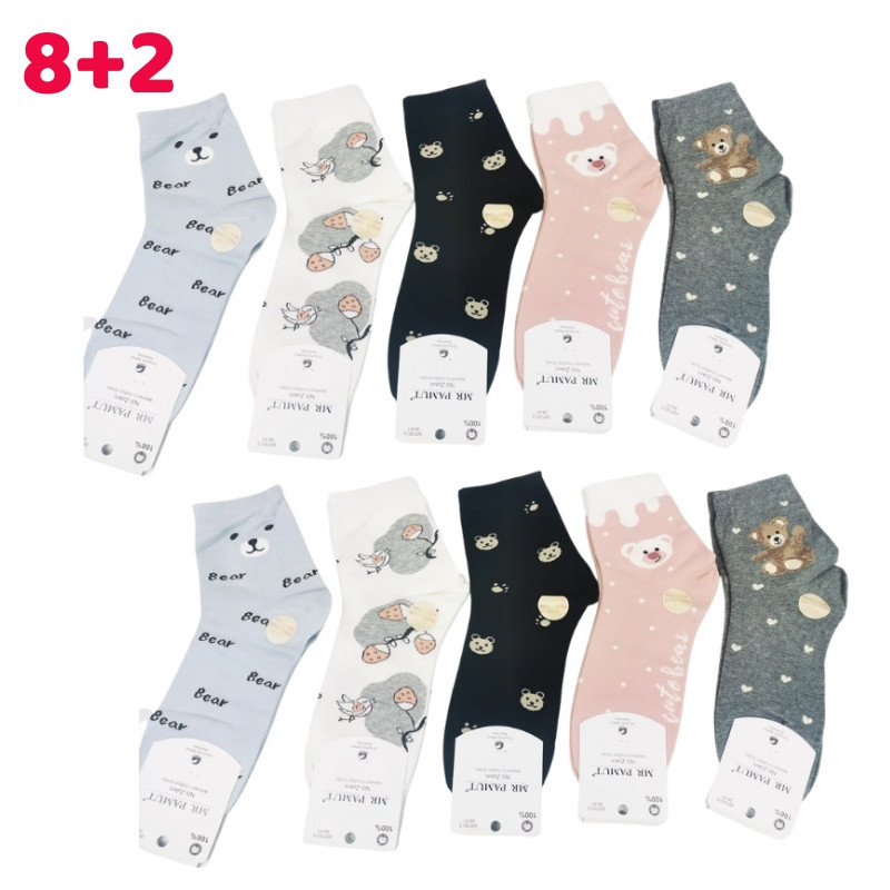 Mäkká a pohodlná sada dámskych ponožiek, zdobená veselým medvedím vzorom. Balenie obsahuje 8 párov ponožiek a 2 páry ako darček, takže celkovo dostanete 10 párov. Praktická voľba na každodenné nosenie, ktorá je štýlová a pohodlná.