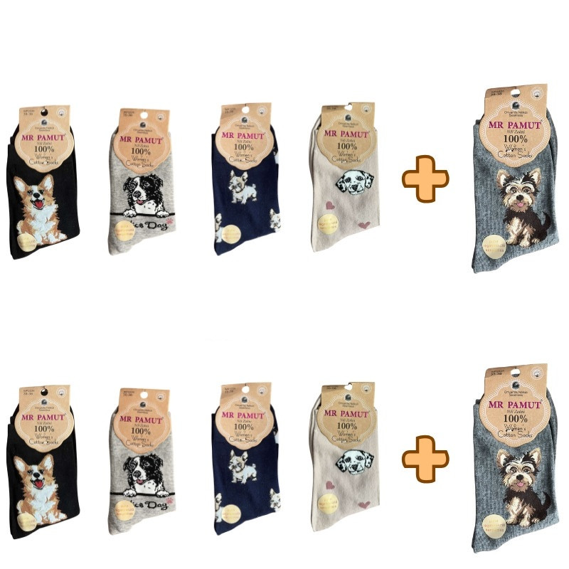 Štýlové a pohodlné dámske ponožky so psím vzorom, ktoré prinesú do každodenného outfitu veselú náladu. V balení získate 8 párov ponožiek a k tomu 2 páry ako darček, spolu teda 10 párov praktických a trendových doplnkov.