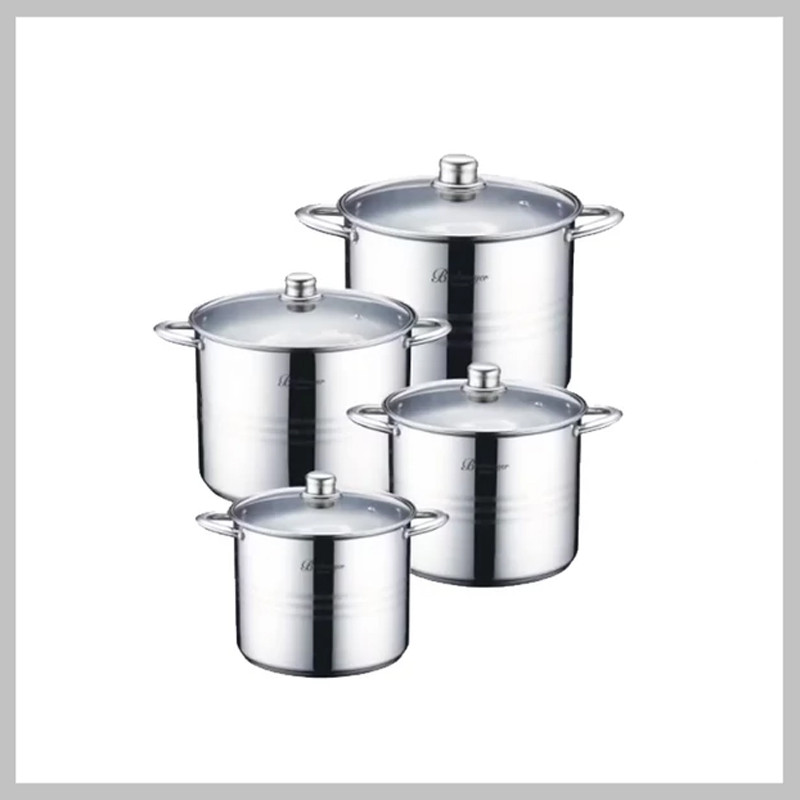 Vysoko kvalitná 8-dielna sada hrncov Bachmayer z nehrdzavejúcej ocele. Možno používať na plynových, elektrických a indukčných sporákoch. Sada obsahuje 4 hrnce rôznych veľkostí s tepelne odolnými sklenenými pokrievkami.