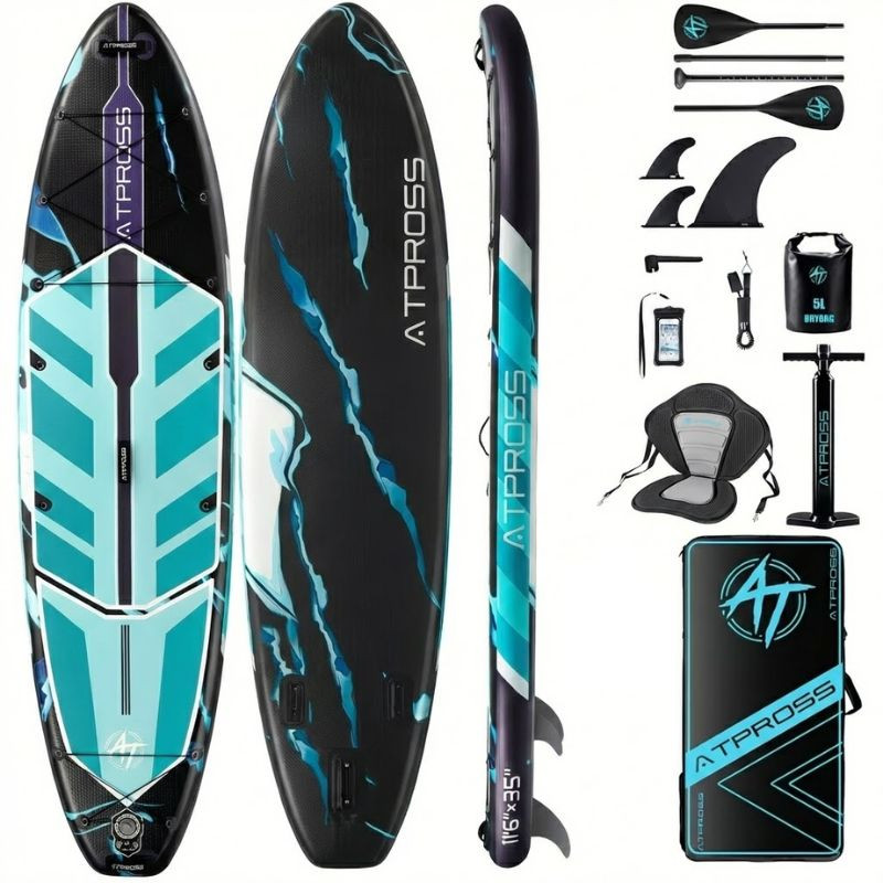 Táto stojaca doska na pádlovanie (SUP) značky ATPROSS, zdobená živým tyrkysovým a tmavomodrým geometrickým vzorom, je perfektným spoločníkom pre vodné dobrodružstvá. Či už ide o pokojnú jogu na jazere, surfovanie na mori, rybolov alebo len relaxačné opaľovanie na vode, táto doska s extra širokým dizajnom poskytuje vynikajúcu bezpečnosť a rovnováhu pre každého používateľa.