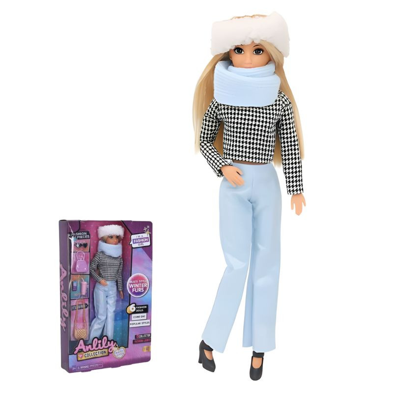 Bábika Anlily na obrázku má na sebe módny čierno-biely sveter s vzorom v tvare slepačích nôh, svetlomodré nohavice, čierne topánky, teplú bielu čiapku s kožušinkou a hrubý svetlomodrý šál.