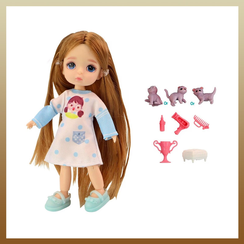 Sada bábiky a mačky. Bábika je vysoká 12,5 cm. Pohyblivé kĺby. Obsah balenia: