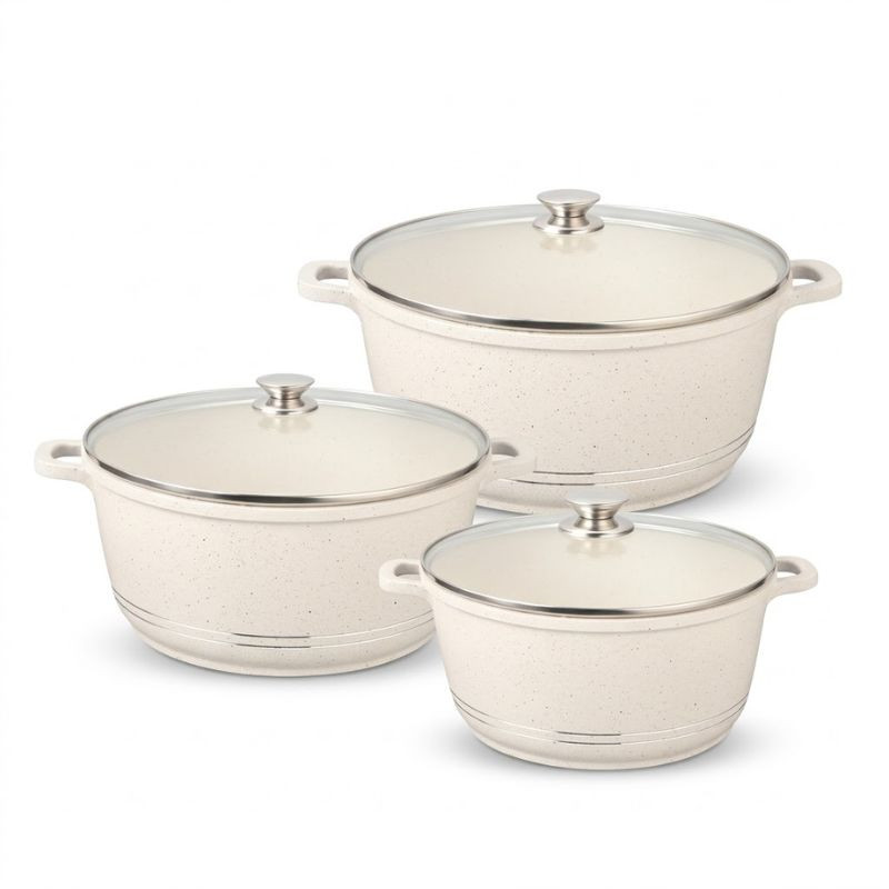 Táto prémiová 6-dielna sada riadu s veľkým objemom má elegantný krémovo mramorovaný povrch, ktorý je ideálnou voľbou na zdravé a nepriľnavé varenie veľkého množstva jedál