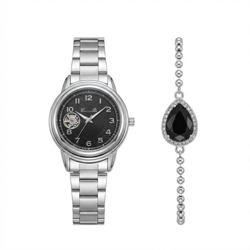 „Black Drop“ Dámske Hodinky a Náramok – Strieborná/Čierna BD01EF