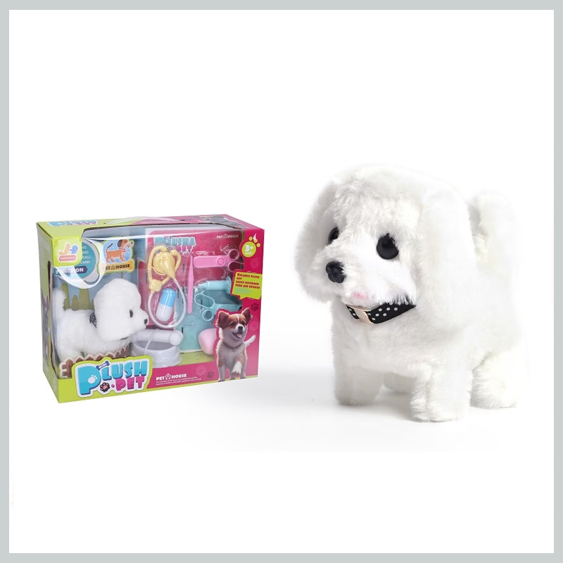Biely chodiaci pes. Chodí a vydáva zvuky.