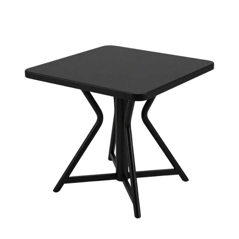Tento praktický a elegantný čierny stôl môže byť perfektným doplnkom vašej terasy, balkóna alebo záhrady. Moderná štvorcová doska stola má zaoblené rohy, čo zaisťuje bezpečný a zároveň estetický dizajn. Masívne, vonkajšie vyklonené valcovité nohy zabezpečujú vynikajúcu stabilitu na každom rovnom povrchu. Vďaka použitiu odolných materiálov stôl dobre znáša každodenné zaťaženie a jeho povrch sa veľmi ľahko čistí. Je ideálnou voľbou pre domáce vonkajšie použitie, ale perfektne zapadne aj na terasy kaviarní a reštaurácií.