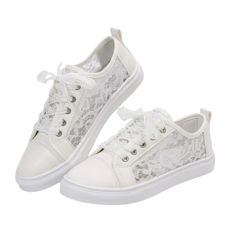Tieto štýlové dámske športové topánky sú perfektnou voľbou pre pohodlný, no zároveň elegantný vzhľad. Špeciálne bočné panely s čipkou dodávajú topánkam ženský a vzdušný vzhľad, zatiaľ čo klasický biely dizajn sa dá ľahko kombinovať s akýmkoľvek oblečením.
