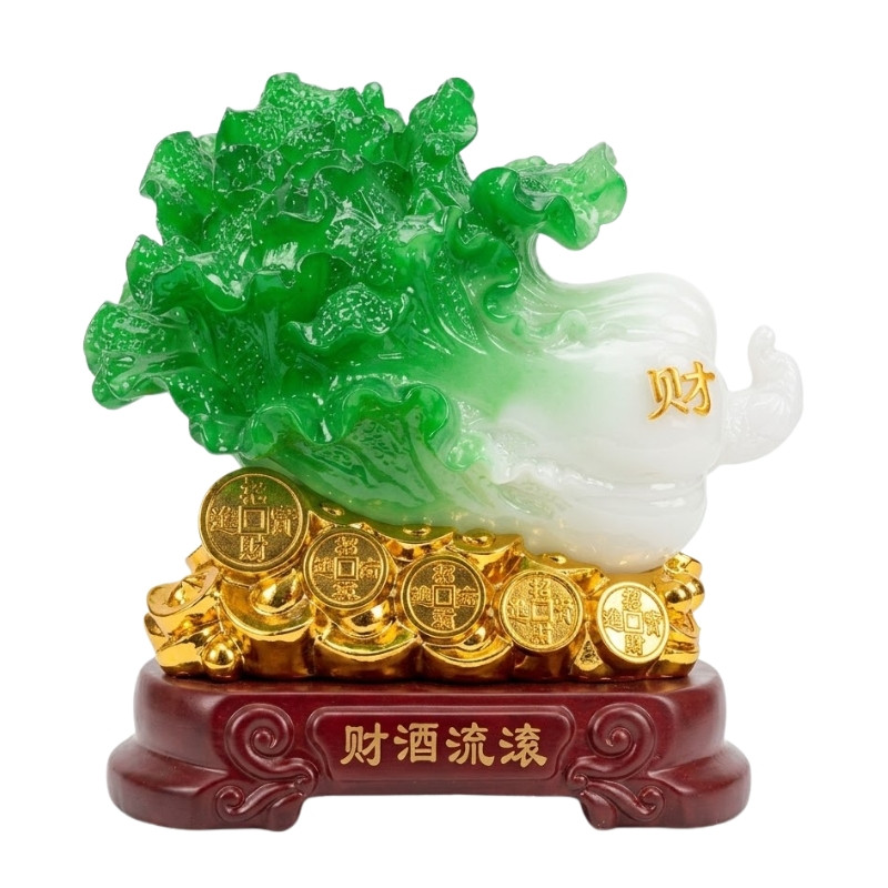 Pôsobivá a jedinečná dekoratívna socha, ktorá symbolizuje hojnosť, šťastie a prosperitu. Zelenobiely dizajn s efektom nefritu a zlaté mince umiestnené pod ňou sú podľa tradície feng shui symbolmi bohatstva a finančného úspechu.