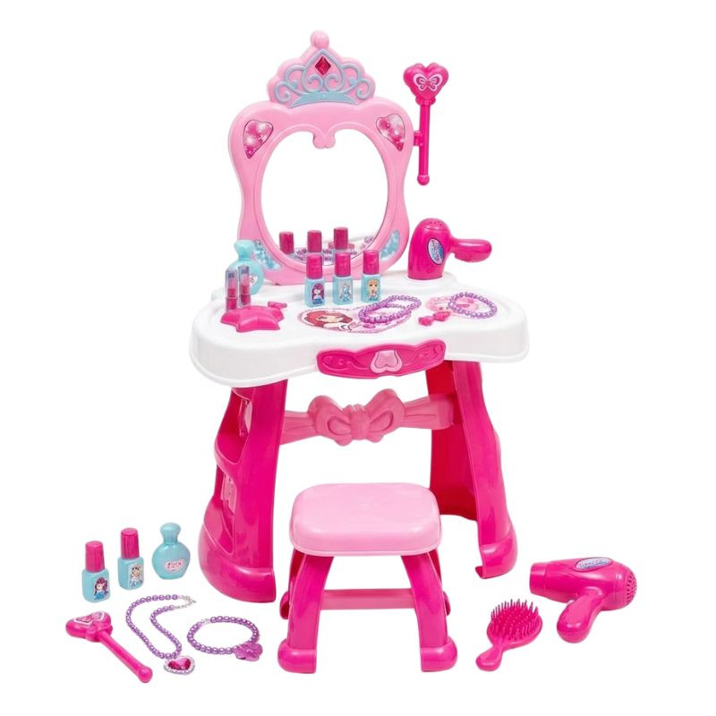 Toaletný stolík so zrkadlom, stolička (v závislosti od typu), čarovná palička, fén a viac ako 21 doplnkov (šperky, kozmetické nástroje).