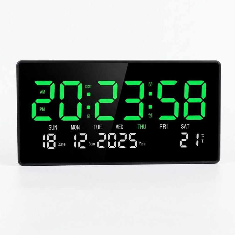 Multifunkčný displej: Zobrazuje čas (hodiny, minúty, sekundy), kalendár (deň, mesiac, rok, deň v týždni) a aktuálnu teplotu (°C) súčasne. Kontrastné čierne pozadie a jasne zelené LED číslice zaisťujú, že je dobre viditeľný za všetkých svetelných podmienok.