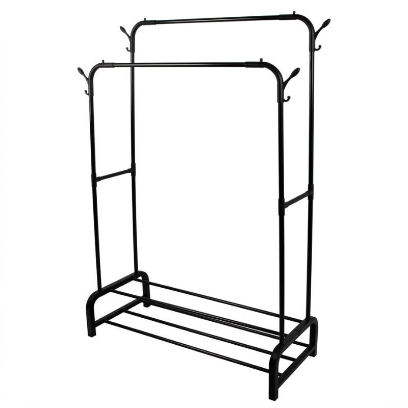 Tento odolný a ľahký kovový stojan na odevy je ideálnym riešením na praktické usporiadanie kabátov, šiat a topánok. Dve vešiakové tyče umiestnené v dvoch rôznych výškach poskytujú dostatok priestoru na skladovanie odevov bez pokrčenia. Štyri dvojité háčiky na bokoch stojanu ponúkajú dodatočný úložný priestor na zavesenie doplnkov, ako sú tašky, klobúky a šály. Dve mriežkové police v spodnej časti poskytujú vynikajúcu plochu na uloženie topánok alebo úložných boxov. Montáž bez náradia umožňuje rýchle a jednoduché zostavenie.