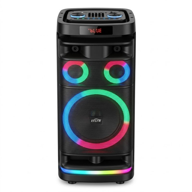 Model EVLYW YE-2030 je jedným z najrobustnejších zástupcov svojej kategórie, ktorý vďaka svojmu ohromnému výkonu 48 000 W P.M.P.O. dokáže naplniť dynamickým zvukom akúkoľvek väčšiu vonkajšiu akciu alebo vnútornú párty. Výška 76 cm a šírka 33 cm dodávajú reproduktoru impozantný vzhľad, ktorý ešte viac zjedinečňuje efektné viaczónové RGB LED osvetlenie. Vstavaná lítiová batéria zaručuje skutočnú slobodu, takže si môžete hudbu vychutnávať kdekoľvek aj bez napájania zo siete. Vďaka dvom bezdrôtovým mikrofónom, ktoré sú súčasťou balenia, a vstavanému efektu Echo môžete usporiadať profesionálne karaoke večery. Ovládanie zariadenia pomocou horných potenciometrov a priloženého diaľkového ovládača je mimoriadne jednoduché a pohodlné.