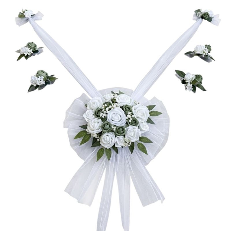 Táto kompletná 7-dielna sada výzdoby na auto je perfektnou voľbou, aby vedúce auto svadobného sprievodu získalo skutočne kráľovský vzhľad. Centrálnym prvkom sady je bohatá kompozícia z bielych umelých ruží a zelených lístkov, ktorú dopĺňajú dlhé, vzdušné biele tylovité stuhy. Dekoráciu je možné rozložiť na kapote do klasického tvaru „V“, čím dodá vozidlu eleganciu a romantickú atmosféru. Súprava obsahuje aj ďalšie menšie kvetinové ozdoby, ktoré možno umiestniť na ostatné časti kapoty, na spätné zrkadlá alebo kľučky, čím sa zabezpečí celková harmónia. Vďaka materiálom odolným voči poveternostným vplyvom si dekorácia zachová svoj dokonalý tvar po celý deň, dokonca aj počas jazdy.