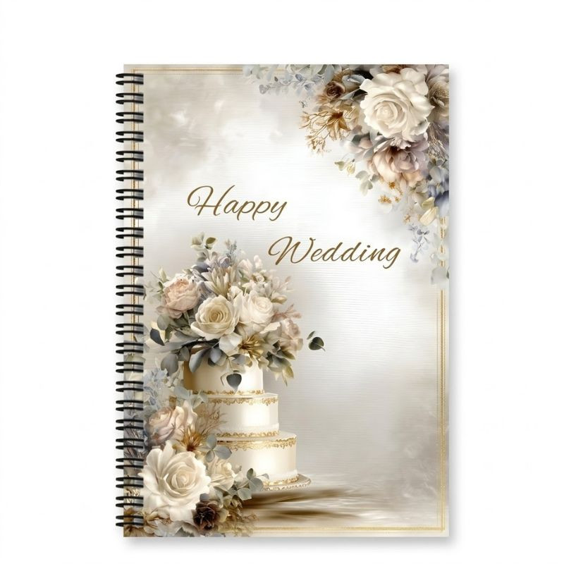 Táto elegantná svadobná kniha so špirálovou väzbou je perfektnou voľbou na uchovanie spomienok na veľký deň alebo zaznamenanie organizačných procesov. Na obálke je vyobrazená rafinovaná grafika, ktorá znázorňuje viacposchodovú svadobnú tortu zdobenú kvetinami a slávnostné poháre na šampanské, čo vytvára romantickú a luxusnú atmosféru. 100 stránok knihy poskytuje dostatok priestoru na srdečné priania hostí, nalepenie fotografií alebo poznámky nevesty. Vďaka kompaktnému formátu A5 je ľahko prenosná a špirálová väzba umožňuje úplné rozloženie stránok pre pohodlné písanie a čítanie.