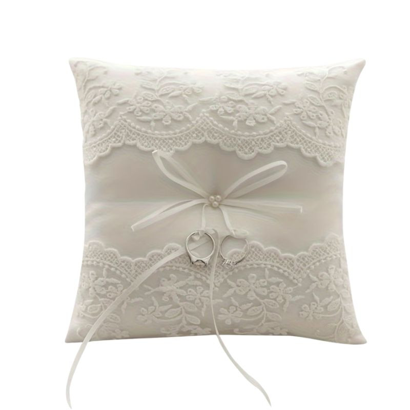 Tento krásne spracovaný, snehobiely vankúšik na prstienky urobí jeden z najdojímavejších momentov obradov ešte nezabudnuteľnejším. Povrch podušky pokrýva jemná čipka s kvetinovým vzorom, ktorá sa perfektne hodí k svadbám v retro aj modernom štýle. Hodvábna mašľa umiestnená v strede a drobné korálky, ktoré ju zdobia, vyžarujú eleganciu a romantiku. Pomocou dlhých upevňovacích stúh je možné prstene stabilne upevniť, takže nositeľ prsteňov – či už je to dieťa alebo domáci maznáčik – ich môže bezpečne odniesť k oltáru.