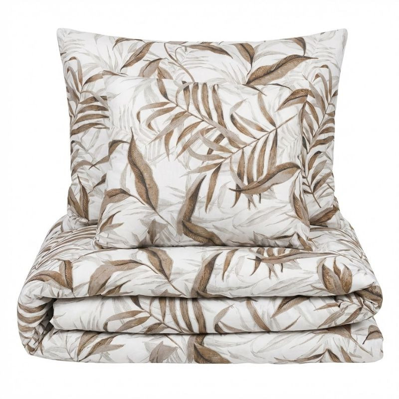 Dizajn: Elegantný tropický vzor listov, ktorý sa pýši rôznymi odtieňmi hnedej a bronzovej farby na čistom bielom pozadí.