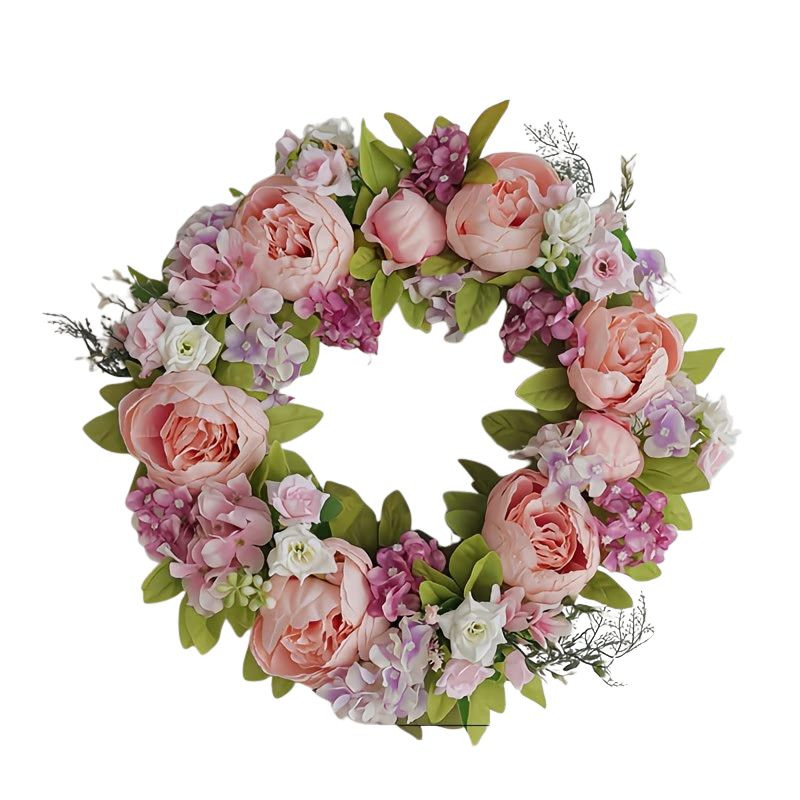 Ak hľadáte ľahšiu, jarnú dekoráciu, tento 360-gramový model je tou správnou voľbou. Hoci má rovnakú veľkosť ako ostatné (45 cm), usporiadanie kvetov je tu vzdušnejšie a ľahšie. Ružové ruže dopĺňajú bledo fialové hortenzie, ktoré vencu dodávajú moderný a svieži vzhľad.