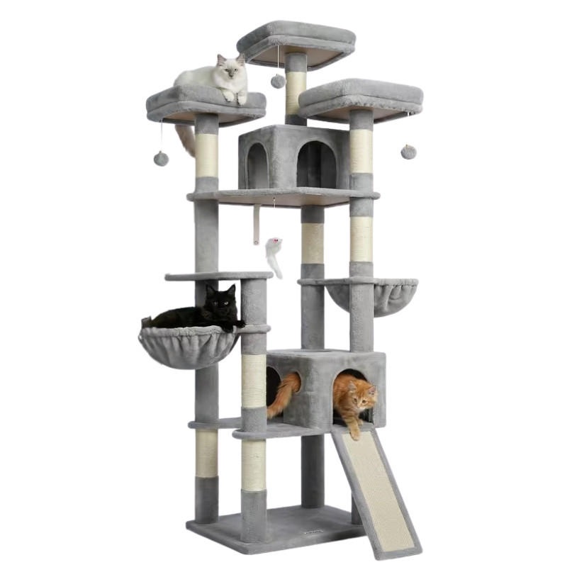 Masívny a extra vysoký nábytok pre mačky, ktorý je perfektnou voľbou aj pre viac mačiek. Vďaka výške nad 210 cm je ideálny na lezenie, oddych a hru, pričom jeho stabilná konštrukcia zaručuje bezpečné používanie. Vďaka viacerým poschodiam, úkrytom a závesným postieľkam ho môžu mačky používať súčasne, bez toho aby sa navzájom rušili.