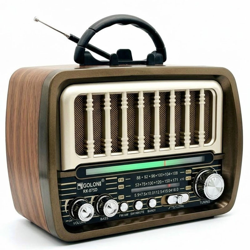 Retro rádio Golon RX-075D spája klasický vzhľad s modernou technológiou. Jeho kryt s dreveným vzhľadom zaisťuje elegantný vintage štýl a zároveň ponúka viacero možností prehrávania hudby a praktické napájanie.
