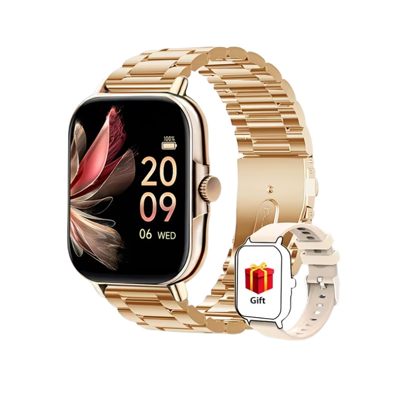 Inteligentné hodinky so zlatým remienkom vyžarujú pocit luxusu. Spojenie lesklých kovových povrchov a modernej technológie vytvára zariadenie, ktoré sa hodí na každú spoločenskú udalosť a zároveň neustále sleduje vašu dennú výkonnosť.