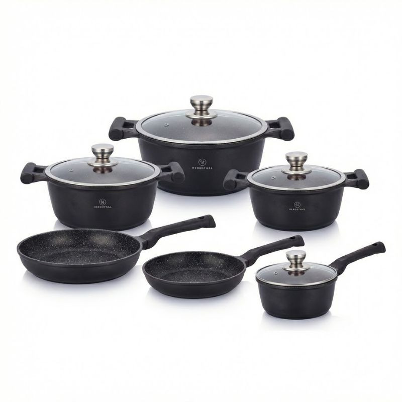 Herenthal HT-CBS 1010M je prémiová 10-dielna sada riadu, ktorá uspokojí všetky potreby modernej kuchyne. Špeciálnou vlastnosťou je PFOA-mentový mramorový povrch, ktorý umožňuje varenie s minimom tuku a zachováva prirodzenú chuť a vitamíny jedál. Nepřilnavá technológia Greblon C zaručuje trvácnosť a jednoduchú údržbu.